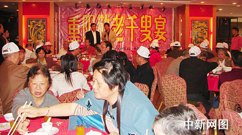 中午,出游归来的千名老人又相聚在王府酒楼参加“千叟宴”,举杯共庆“重阳节”。席间但看壶中酒,杯杯先敬老年人。衡阳市长彭崇谷在盛宴开始后,举杯向老人们敬酒。席间,主办方还朗诵了清朝康熙皇帝在阳春园第一次举行千人大宴中席赋的《千叟宴》诗一首,博得老人们的阵阵掌声。今年已80高龄的郑仲仪老人饮了两杯酒后,兴奋不已,对记者说,自己还从来没有与这么多的老年人一同赴宴,能参加这样的盛宴,不管吃什么自己都觉得很开心。回去后将告诉儿孙们,要把中华民族敬老爱幼的传统美德一代一代传承下。