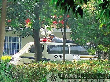 当日上午9时15分,记者在南宁市第八人民医院内见到,医院篮球场南侧一片树林里,一头水牛正站在树间吃草,篮球场边停靠着两辆警车,有持枪民警在附近警戒。