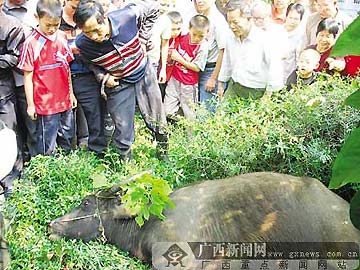 10月21日,一头水牛被牵进南宁市明秀西路细新巷时,受惊奔走,接连撞倒1男3女后,窜进了南宁市第八人民医院内一片树林里。上午10时47分,一声枪响,水牛被民警击毙。