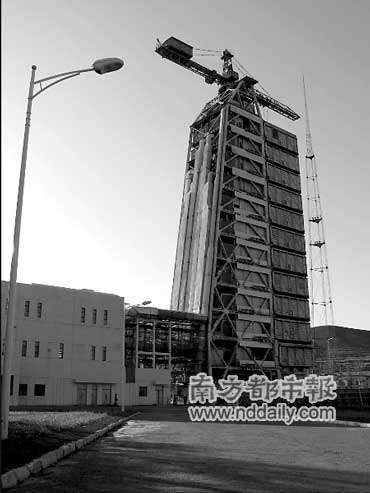 站到中心的发射塔的11层平台上,正好可以看清对面山顶的古烽火台,据说那是杨家将的遗址。夕阳眩光中的古老烽燧,长空下线条精确的火箭发射塔,两个时代的军事图腾之间,似乎注定了某种因缘。