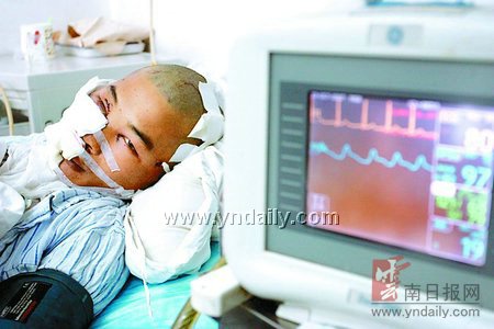 昨日,实施了面部缝合手术后,29岁的陈三拉静静地躺在昆医附一院口腔颌面外科病床上,他的右脸全部被包了起来,由于伤势严重,已经很难开口说话。
