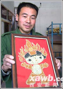 据陈群虎介绍,一次偶然的机会,他从杂志上看到一篇报道,北京有人用五谷杂粮经过处理以后做出了衣服,他想既然能用粮食做衣服,也就能用粮食写字作画。随后,陈群虎便放下手头的工作,专门来创作他的五谷字画。经过半年多的研究学习和尝试,陈群虎终于成功创作出了具有浓浓乡土气息的“五谷字”。他的作品全都是用草籽、糜子、豆子谷物制作而成,字画中的颜色也都是用这些颜色各异的谷物搭配成的。他作画时用的工具都是在果树嫁接时用的嫁接刀、镊子、锯等。陈群虎告诉记者,现在已经有不少作品被乡亲们收藏了,这给了他极大的鼓舞和激励,他将一直创作下去。(记者 张海鹏文/图)