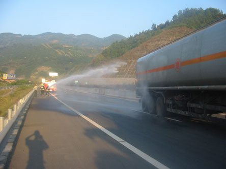 调出一支喷雾水枪,对事故槽车实施定时稀释,防止高温引起酒精起火自燃;