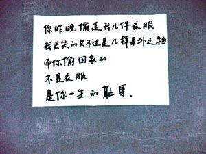 孙女士说,她看了纸上的几行字后,不知何故,询问后得知,原来邻居何女士前天晚上将孩子的衣服洗完后,晾在门外的胡同里,夜里忘了收回来,第二天早上出门一看,几件较好的衣服全不见了。何女士又气又郁闷,便想写一首小诗来抒发愤懑的心情。“我这个邻居是一家公司的职员,喜欢文学,平时总爱写几首小诗抒发情感。”孙女士说。