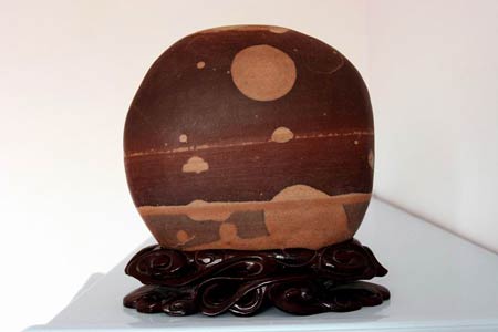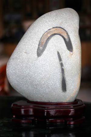 无独有偶,当日下午1时许,记者在西固区河口镇的张先生家中也看到了一块类似的黄河奇石,不同的是该黄河石的体形稍大,呈淡褐色,黄河石正面上部有一个直径约4厘米的银色满月,满月的左下方有一颗卫星在做绕月飞行,而且绕月轨道清晰可见。张先生告诉记者,大约一年前,他从一位石友处发现了这块黄河石,当时觉得挺普通,并没在意。最近电视、报纸连续报道“嫦娥”奔月的相关消息,他突然发现这块黄河石颇似卫星升空后绕月飞行的场景,便从那位石友处高价购得。(记者 王少丹)