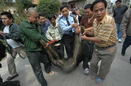 记者随即向福州市森林公安局反映,该局局长亲自带人到场查看,确定了这是一只苏门羚。由于该羚羊约重100公斤,森林公安请来了福州市动物园两位专家支援。为避免其伤人,专家决定先对其麻醉。