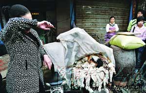昨天17时30分,记者来到庆丰市场,这里有个活鸡活鱼专卖区。就在这里,记者刚好碰上了杀狗商贩的交易。