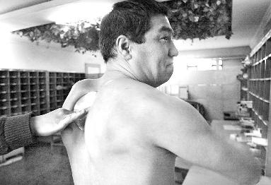 昨天(10月25日)上午,记者在米东区邮政局见到35岁的阿里甫。他一米八的大个子,健壮结实。在同事们的帮助下,他开始演示他的绝技。