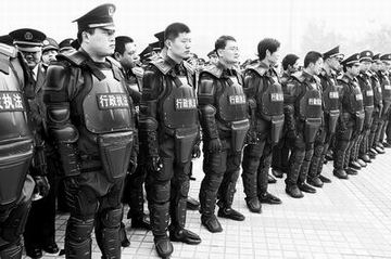 10月27日,近千名执法队员聚集绿城广场,其中站着一些身着“盔甲”的“防暴警察”,他们就是各区负责查处非法养犬的专业执法队员。