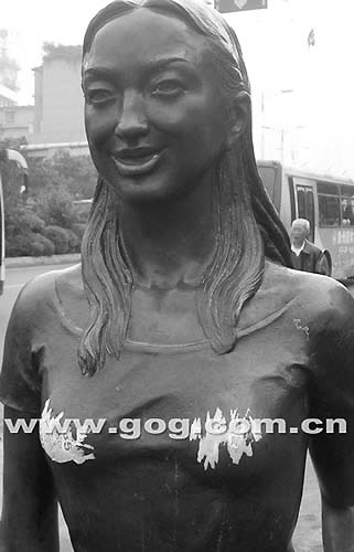 昨日,记者途经河滨公园门前的人行道上时,见到两块都市牛皮癣居然粘贴在铜像雕塑少女的胸部,一些市民觉得实在不雅,想撕掉却因粘得太牢而无果。(记者 陈华飞)