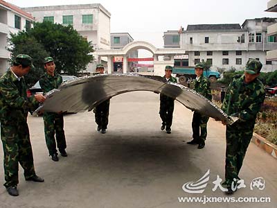 因天气原因,直至30日下午,飘落于全南县深山的运载“嫦娥一号”卫星的长征三号甲火箭整流罩残骸,在该县人武部人员的护送下运往有关部门。记者获悉后,独家对此进行了采访。