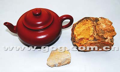 为了证实此壶真伪,王顺发还专门赠送骆先生制壶原矿两块(见图),同时在收藏证中提到并以此为证。在上海科技出版社出版的《紫砂壶鉴赏宝典》一书中记者看到,图中大块的原矿叫石黄心,小块的叫大红泥矿,两者按照一定比例混合则成大红袍泥,此泥产于宜兴市黄龙山,泥质细腻密度大,属十分稀有泥类,是制宜兴紫砂壶顶级泥料。