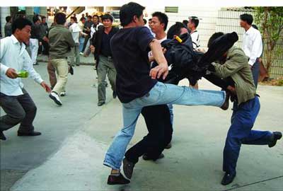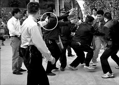 5分钟后,校方员工再次出动,有的人手上还拿着两根一米长的铁棍,而工人们顺势从门口的竹篱笆处拔下七八根碗口粗的毛竹对铁棍,双方开始一场混战,“啪、啪”声不绝于耳。两三分钟后,毛竹被打烂,就在工人高喊着找砖头时,警方赶到。一名警察一边高喊“不许打架”,一边拿着手中的辣椒喷雾器对着打斗双方喷射……