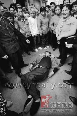 记者在现场看到,伤者躺在马路中间,妻子抱着丈夫滚在地上痛哭不已,上百名围观市民看到这种状况,纷纷谴责执法人员。情绪激动者还将执法人员围住,现场一片混乱,该路段交通短暂堵塞。十多分钟后,伤者被执法人员抬到路边,交通得以缓解。