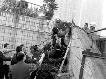 记者赶到现场时,正当消防战士准备着手解救该男子。记者看到,现场有数百居民围观。跳楼男子站在一7层高楼楼顶外侧的巨幅广告牌钢架上,楼下警方拉起了警戒线。几名身系保险绳的消防战士从该楼楼顶慢慢攀爬上了巨幅广告牌钢架。惊心动魄的一刻终于发生了,消防战士将该男子拉住,并用随身携带的安全绳缚住男子身体,将男子从钢架转移至楼顶,整个解救过程,历时40余分钟。