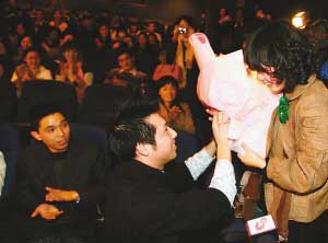10日下午3时05分,济南泉城路新世纪电影城某放映厅。当电影预告片播毕,期待中的电影《色·戒》却并未照常开始。观众们尚未反应过来,屏幕上出现了一个小伙子的身影:“还记得吗?我们第一次见面时的场景……”小伙子略带颤抖的声音流露出内心的紧张与激动,而几乎是在同一时刻,观众席里传出了一个女孩子激动的哭泣声……