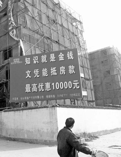 “近段时间打电话和上门咨询的买房者很多,但对此优惠政策持怀疑态度的也不少。”在广告牌附近的销售接待处,售房小姐告诉记者,该公司推出的这项优惠政策,主要面对一些刚参加工作、没有完成“原始积累”的中专及中专以上学历者。公司的一份文件明确表示,“文凭抵房款”具体标准是:中专1000元,大专2000元,本科3000元,硕士6000元,博士10000元。
