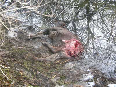 就在这时,动保处的同志接到电话:板石镇孟岭村五队村民赵智国家的牛被咬死。经查,11月9日,赵智国家一头3个月的公牛失踪,经查找在距村屯2公里处的盘岭沟发现牛已被咬死,牛的臀部已被吃掉。11月12日,管理局野生资源保护处工作人员认定该牛确被野生东北虎咬死。