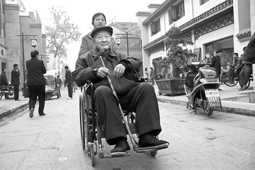 “卢爹,今天大盘怎么样?”当老人结束一天的看盘,由他的保姆推着轮椅回到太平街时,一路上都有人不断地笑着向他询问,而他只是呵呵笑着点头示意。(记者龚磊文/图)
