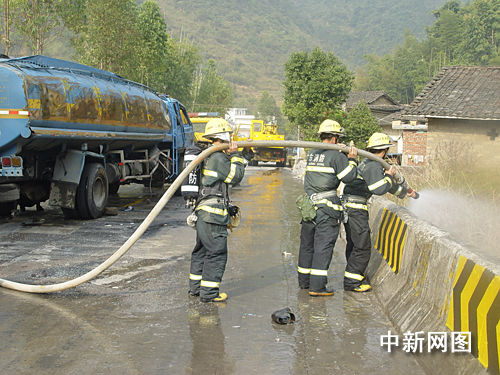 新丰县公安局副局长陈如锋组织交警很快封锁了现场,实施交通管制。消防官兵穿上防化服,用两台消防车从河里抽水,用射水枪喷射侧翻的槽罐车,迅速稀释从车上流出的液体甲醛。吊车随后赶到,工作人员带上口照,冒着生命危险,靠近槽罐车,将侧翻的槽罐车吊起,消防官兵继续用射水枪向槽罐车猛烈射水。