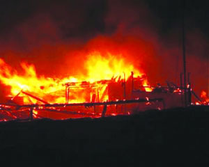 就在船主专心致志捕鱼之际,突然他感到江面映出火苗的光亮。回头一看,只见船舱里冒出一片火来,“不得了,怎么失火了?”船主大吃一惊,连忙丢下渔网,拎起一桶水就泼过去,但杯水车薪,根本不管用,火势越来越大,他将带绳的桶扔到江里,想从江里打水上来扑火,但还没等打上来第一桶水,刹那间,整个船舱就成了一片火海。由于火势凶猛,他的头发眉毛都被烧焦了。看着眼前所有东西都着火了,他意识到还是逃命要紧,被迫弃船,转身向船头跑去,对着江里的栈船就跳了过去。船主刚跳上栈船,就听后面“轰”的一声巨响,放在船舱里的那桶柴油也被烧着了。