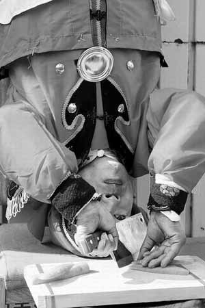 刘永全说,除了这些,他还能倒立打腰鼓。在助手的帮助下,刘永全左右膝盖各绑上一个腰鼓,腰上一左一右系了两个,然后又在脖子处固定了一个腰鼓。一切准备工作做好,刘永全“腾”地一下倒立起来,然后两手上下翻飞,节奏感极强,鼓声铿锵有力,从旁边经过的路人也被吸引了过来。“树活皮,人活脸,出门前一定要化个妆。”刘永全说着,拿起放在旁边的油彩小心地勾勒了起来,一会儿,勾勒出了一张活灵活现的猴脸。