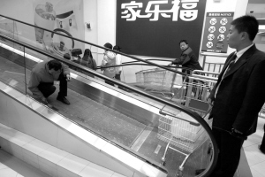昨天中午1点多,记者在家乐福立水桥店看到,3层到2层的下楼电梯已停运。在电梯下口处,最底端的两块两米长玻璃挡板已完全破碎,电梯缝中仍卡着大量玻璃碎片,保洁人员正在清理。