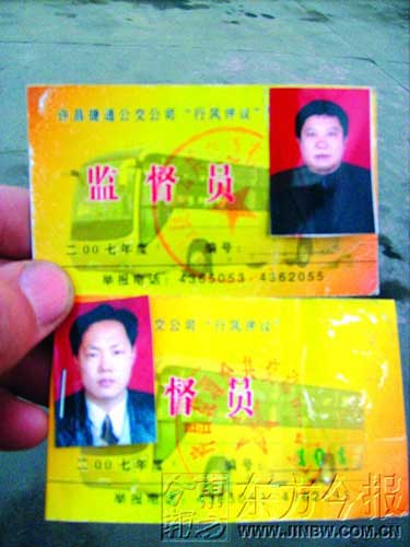 28日下午5时许,记者在许昌市捷通公交公司采访时,该公司工作人员向记者证实说,他们下午还接到一名自称是邓庄乡政府副乡长的男子打来的电话,向他们索要被收走的监督员证。该男子说,他的监督员证是许昌市建委的一位朋友给办的,工作人员随即追问他这位朋友的姓名,其又辩解说,想不起来了。