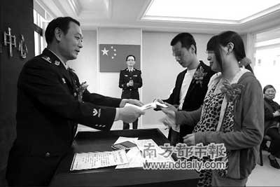 在得知女友怀上了孖仔后,为了给即将出生的两个宝宝一个合法的身份,中山市看守所内的服刑人员袁某提出要与女友结婚。看守所所长证婚,婚礼现场的布置由看守所的民警一手张罗。11月21日,袁某与女友如愿在中山市婚姻登记中心登记成为合法夫妻,成为中山市首个登记结婚的服刑人员。