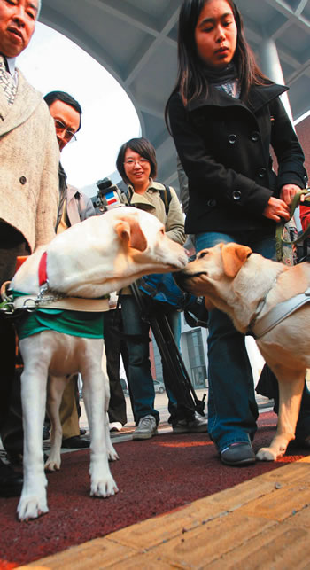 相比日本的导盲犬,正在训练中的中国导盲犬毫不示弱,它们也能跟随驯导师的英文指令作出相应的反应,比如说一声“go”,听话的拉布拉多犬就会带领主人前行。上海市残联的有关人士告诉记者,今年3月起上海正式启动了导盲犬的训练培育项目,其中14条分批送往上海的家庭寄养,还有4条作为探索犬放在南京训练,这次前来的导盲犬就是正在南京“集训”的“精英”。