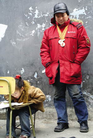 在覃纪虎的“卖场”,他把荣誉证书及相关报道的剪报摆了满地,并打出卖奖章的招牌,女儿晓艳在一旁静静地伏在一把椅子上写作业。不时有过往的行人前来观看,然后为他们捐一点钱。