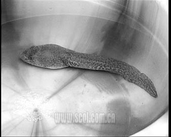大千世界,无奇不有。记者在广安市邻水县见到了一条 “怪鱼”:全身没有鱼鳞和鱼须,也没有胸鳍和腹鳍,像蝌蚪又非蝌蚪,似鳗鱼而非鳗鱼,其叫声像野鸡(右图)。广安水产专家也不知其为何物。