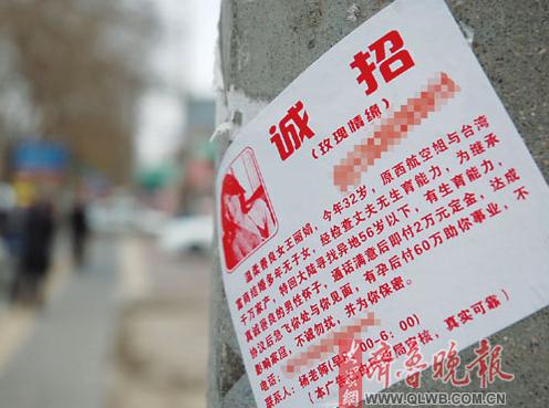 “温柔善良女王××,今年32岁,原西航空姐,与台湾富商结婚多年无子女,经检查丈夫无生育能力。为继承千万家产,特回大陆寻找异地56岁以下,有生育能力,真诚善良的男士怀子,通话满意后即付2万元定金,达成协议后急飞你处与你见面,有孕后付60万助你事业,不影响家庭。不诚勿扰,并为你保密。”(见右图)这是记者在滨州车站附近看到的一电线杆上的广告内容,广告下边还印着“本广告已由民政局审核,真实可靠”。记者在调查中发现,此类广告一般张贴在车站、广场等人流量大却隐蔽的角落,广告上的联系电话均为外地手机号码。