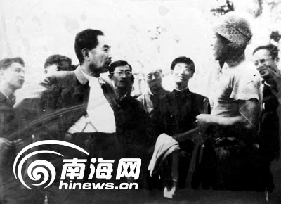 上午,身穿深灰色中山装的周总理来到农场橡胶园——这是儋县爱国华侨1919年从南洋经过千辛万苦引种成功的,叫“天任”、“蔡惠”胶园,它是新中国发展橡胶主要的采种基地。