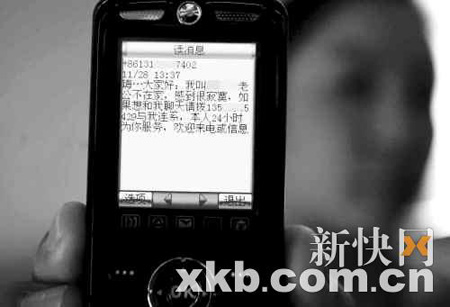 据称,这个神秘的陌生人曾一度发短信息要求和郭小姐约会。见郭小姐不予理睬,对方又发些编造的短信给郭小姐的丈夫。“居然说我背着丈夫做对不起他的事,这纯粹是诽谤!”郭小姐气得咬牙切齿。