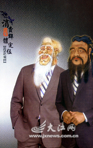你能想象鹤发童颜、长须飘飘的我国古代圣人孔子和老子,在穿上西装、打起领带后将是什么样子吗?6日,在南昌市北京东路上某服装公司门前,一幅大型的宣传画引得众多行人驻足观看。原来,这幅宣传画上的古代圣人——孔子和老子被穿上了西装,打上了领带,成了西装革履的时装模特。然而,商家自鸣得意的“创意”却引得大多数过往市民们的纷纷指责,认为商家如此促销太不严肃,有违商业道德。