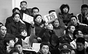 这是地坛庙会拍卖的现场,100多名商户正争夺明年春节庙会的45个饮食摊位。