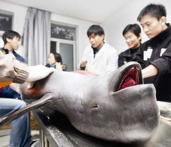 下午4时许,中国科学院水生所白鳍豚馆内,工作人员正在进行解剖。