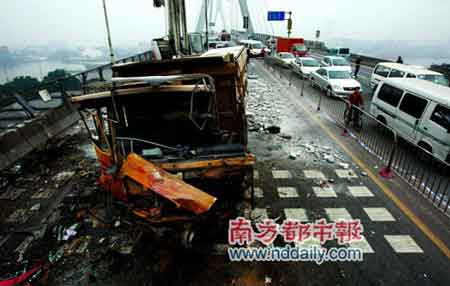 泥头车再惹是非!昨日清晨6时许,一辆满载水泥砖的泥头车在广州荔湾区鹤洞大桥桥面北往南爬坡行驶时,突然失控撞倒护栏,一头撞向迎面驶来的一辆中巴,差点将中巴撞下20多米高的桥。中巴上的30名司乘人员受伤,其中4人重伤。