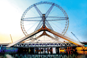 “天津之眼”摩天轮2005年开工建设,预计明年奥运会前可以开张纳客。昨日,在施工现场记者看到,“天津之眼”摩天轮已经屹立在永乐桥上,引来许多市民观看。一位正在钓鱼的秦先生说:“赶快拍个照吧,今后咱们天津的海河又多一个景点。”