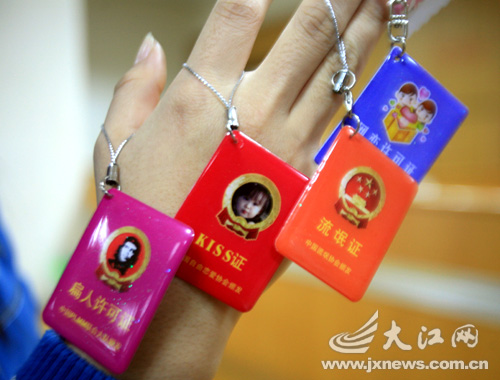 证件,人们日常生活中最平常也最不可或缺的用品,如今被网络恶搞之风席卷:“恋爱证”、“帅哥证”、“结婚证”、“处女证”等令人啼笑皆非的“恶搞证件”层出不穷。很多学生将它们挂在手机、钥匙或背包上,将之视为一种新的校园时尚元素。记者发现,被恶搞的红色“结婚证”与真正的结婚证很相似,内页可以填写两个人的姓名,只是封面上印着“中国婚姻联盟颁发”字样。在“光棍证”、“流氓证”等证件中,同样有大量的恶搞内容,有些十分低俗。怀揣着“流氓证”的南昌市某小学三年级学生万兵(化名)稚气未脱地对记者说:“我是流氓我怕谁,拿着它多帅啊!”