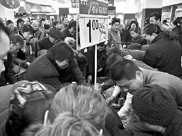 昨天上午8时30分,沃尔玛洛阳市景华路店开门迎宾,在地下一层大卖场,1元可乐和雪碧成为前来购物市民的首选。老人们蜂拥而上(如图)。虽然标牌上写着“每人限购5听”,但不少老人只顾弯腰往怀里揣,全不顾被踩踏的危险。(记者 杨非)