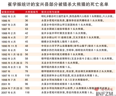 原宝兴县林业局局长、原四川宝兴蜂桶寨国家级自然保护区管理局局长、大熊猫专家崔学振不完全统计,二十年间宝兴县就有20只大熊猫被猎杀。(见附表)