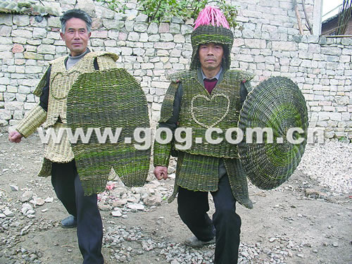 近日,被蜀国丞相诸葛亮用火烧死的藤甲兵在安顺“复活”(如图)。记者昨日在安顺开发区歪寨村看见,该村村民根据老人的回忆复制的两副藤甲已经全部完成,村民穿在身上,活像三国时期曾大败蜀军的“藤甲兵”,令人惊奇不已。