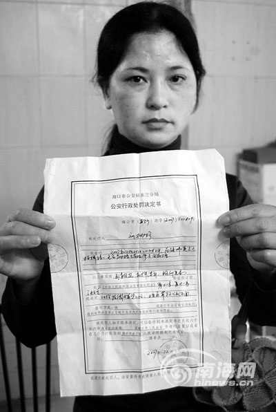 刘女士的“行政处罚决定书”这样写着,2007年12月21日22时许,在海口美兰区板桥路无名麻将馆内参与赌博,根据治安管理处罚法规定,对你收缴赌资二十元,治安罚款伍百元。