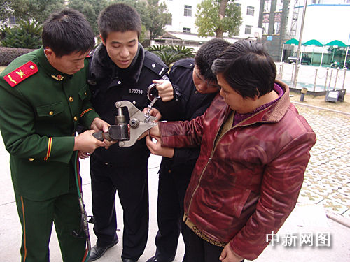 中新网温岭12月28日电(记者 柴燕菲 通讯员 陶文波 彭军伟) 12月27日下午,温岭市新河派出所的民警带着一位中年妇女来到温岭消防大队救助,原来该中年妇女的右手腕被手拷牢牢拷住,民警用钥匙以及其它方法尝试都无法打开。最后,在大家齐心协力的帮助下,巧妙的利用手动液压剪、钳子等方法成功解救出了手腕。
