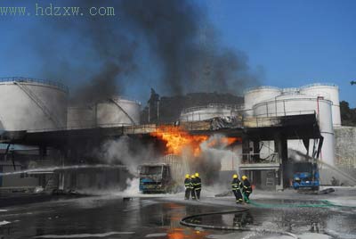 紧接着,10多名头戴安全帽、身着便服的工人跑了出来,他们打开了库区里的消防栓,冲向槽车附近灭火。据消防支队有关人士介绍,小张所说的这些工人是港丰石化公司的专职消防队员。火灾发生后,队员们立即启动储罐冷却喷淋系统,降低事发附近储罐发生燃烧的可能。