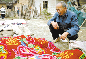 记者在一位老农的指引下,才找到位于深山中的案发现场。清晨7时的深山很安静,路边的屋内传来一阵阵低沉的哭声,草地上残留大摊的血迹,似乎还没有完全干涸。在瓦房对面的一个晒台上,几卷破旧的棉被和一堆杂乱的衣服中露出一只人脚,带“喜”字的棉被下面盖着尸体,现场没有任何人看管,没有警戒线,也没有警车和警察,一切都显得那么静谧。