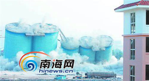 仅5秒钟,7个高近30米的大型水泥储料仓库在精确的控制下实现成功爆破,轰然倒下。12月30日下午,原三亚天涯水泥总厂难度最大的拆除工作圆满完成。
