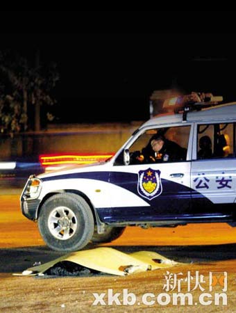 傍晚时分,死者尸体仍在路边,一辆警车一直守在死者旁边。